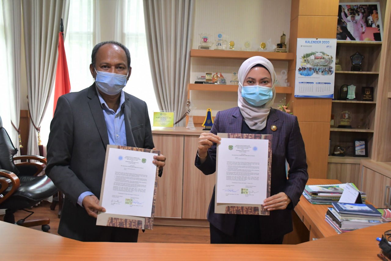 LUWU UTARA - Pemerintah Daerah (Pemda) Kabupaten Luwu Utara dan Akademi Teknologi Industri (ATI) Dewantara Kota Palopo menjalin kerjasama pengembangan sektor teknologi dan industri. Kerjasama ini ditandai dengan penandatanganan MoU antara Bupati Luwu Utara Indah Putri Indriani dan Direktur ATI Dewantara Palopo DR. Suaedi, S.Pd., M.Si., Rabu (17/2/2021), di Ruang Kerja Bupati Luwu Utara.